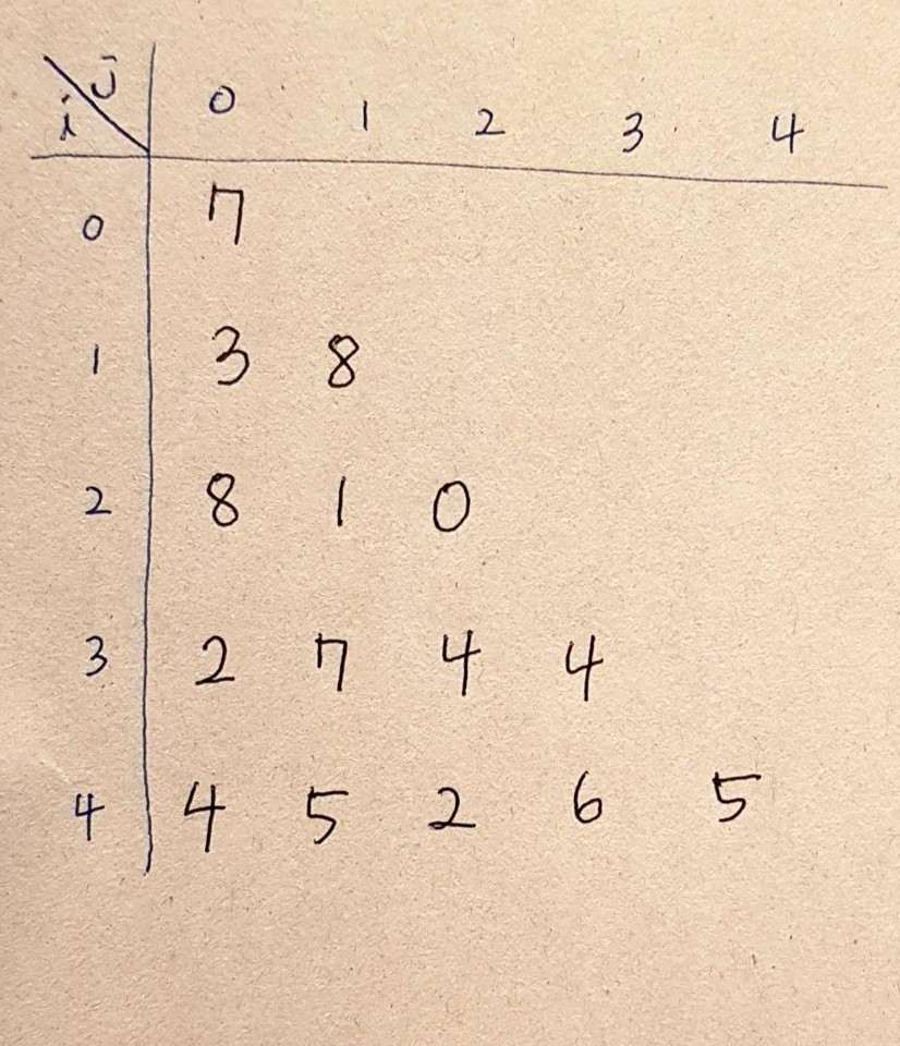 위 그림은 피라미드 모양으로 되어있지만 사실 2차원 배열에 넣는 것이기 때문에 실제 데이터는 다음과 같이 들어간다.