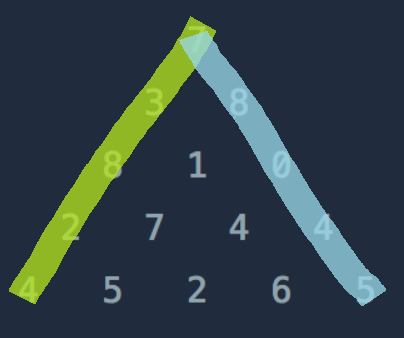 삼각형의 정보가 담긴 배열 triangle이 매개변수로 주어질 때, 거쳐간 숫자의 최댓값을 return 하도록 solution 함수를 완성하세요.