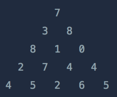 int[][] triangle = new int[][]{{7}, {3, 8}, {8, 1, 0}, {2, 7, 4, 4}, {4, 5, 2, 6, 5}};