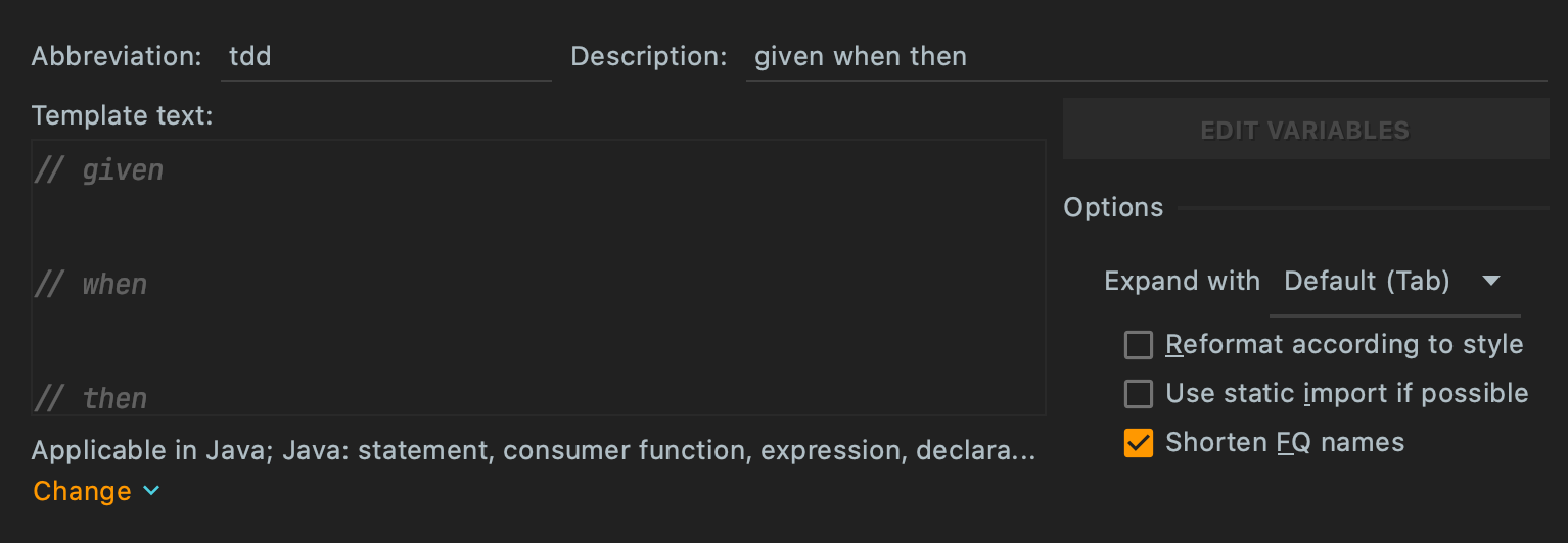 Java 를 클릭 > 우측 상단의 + 버튼을 클릭 > Live Template 클릭한 후, 아래와 같이 셋팅해주면 끝이다.