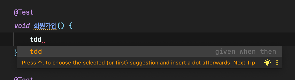 자, 이제 테스트 코드 안에서 tdd 를 입력해주면...